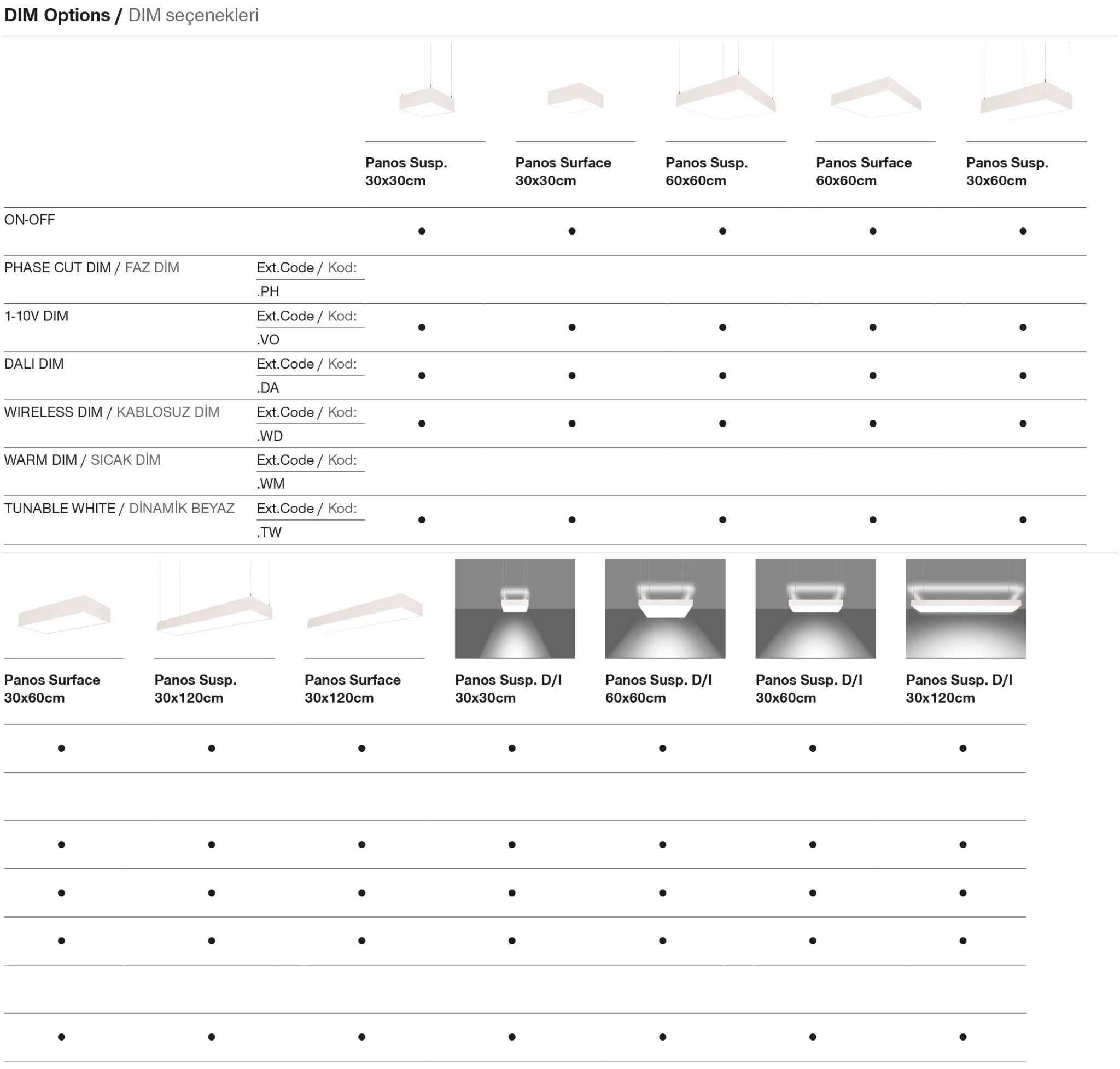 Alüminyum gövde. Opal veya mikroprizmatik difüzör seçenekleri mevcuttur. Şebeke gerilimi: 220-240V / 50-60Hz. 1-10V, DALI, Casambi DIM, Dinamik Beyaz DALI, Dinamik Beyaz