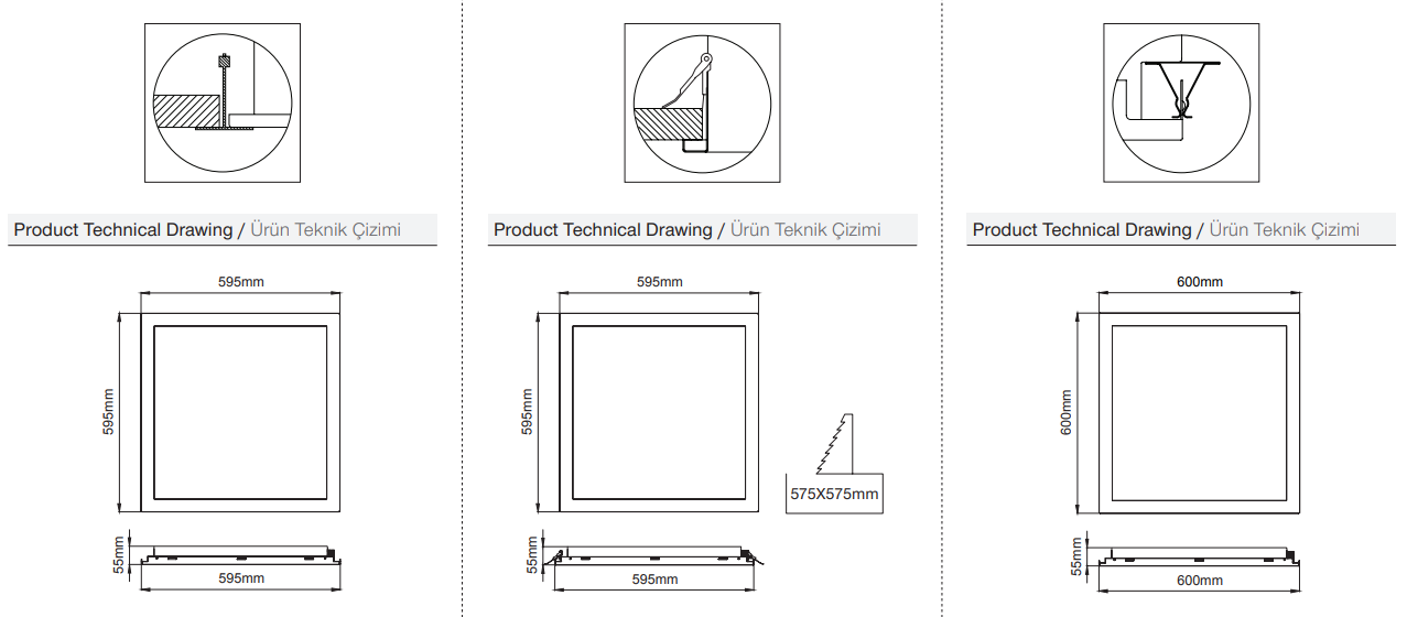 PANEL crée un aspect de fenêtre lumineux sur les murs et les plafonds. Convient pour l'éclairage général. Il a une structure en profilé d'aluminium. Un plafond en laine de roche et des options intégrées sont disponibles. Avec sa version encastrable de même finesse, il offre une facilité d'application dans les zones à faible profondeur de plaques de plâtre. Une efficacité maximale est obtenue avec le diffuseur LGP à haut rendement.