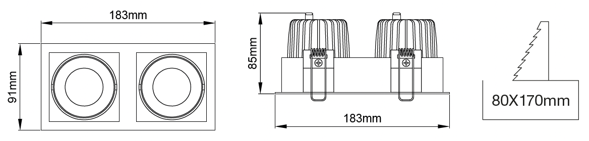 | 7 | 2x7W - 180mA | 835 | CRI>80 - 3500K | 940 | CRI>90 - 4000K | ![]() | FL | 2x50° - Flut | ![]() | 03 | Schwarz |