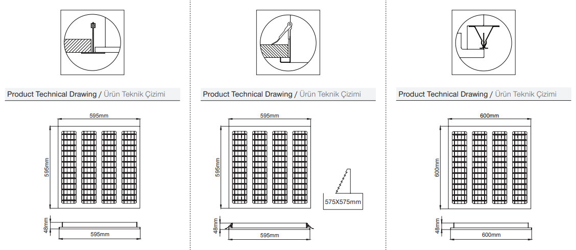 PANEL crée un aspect de fenêtre lumineux sur les murs et les plafonds. Convient pour l'éclairage général. Il a une structure en profilé d'aluminium. Un plafond en laine de roche et des options intégrées sont disponibles. Avec sa version encastrable de même finesse, il offre une facilité d'application dans les zones à faible profondeur de plaques de plâtre. Une efficacité maximale est obtenue avec le diffuseur LGP à haut rendement.